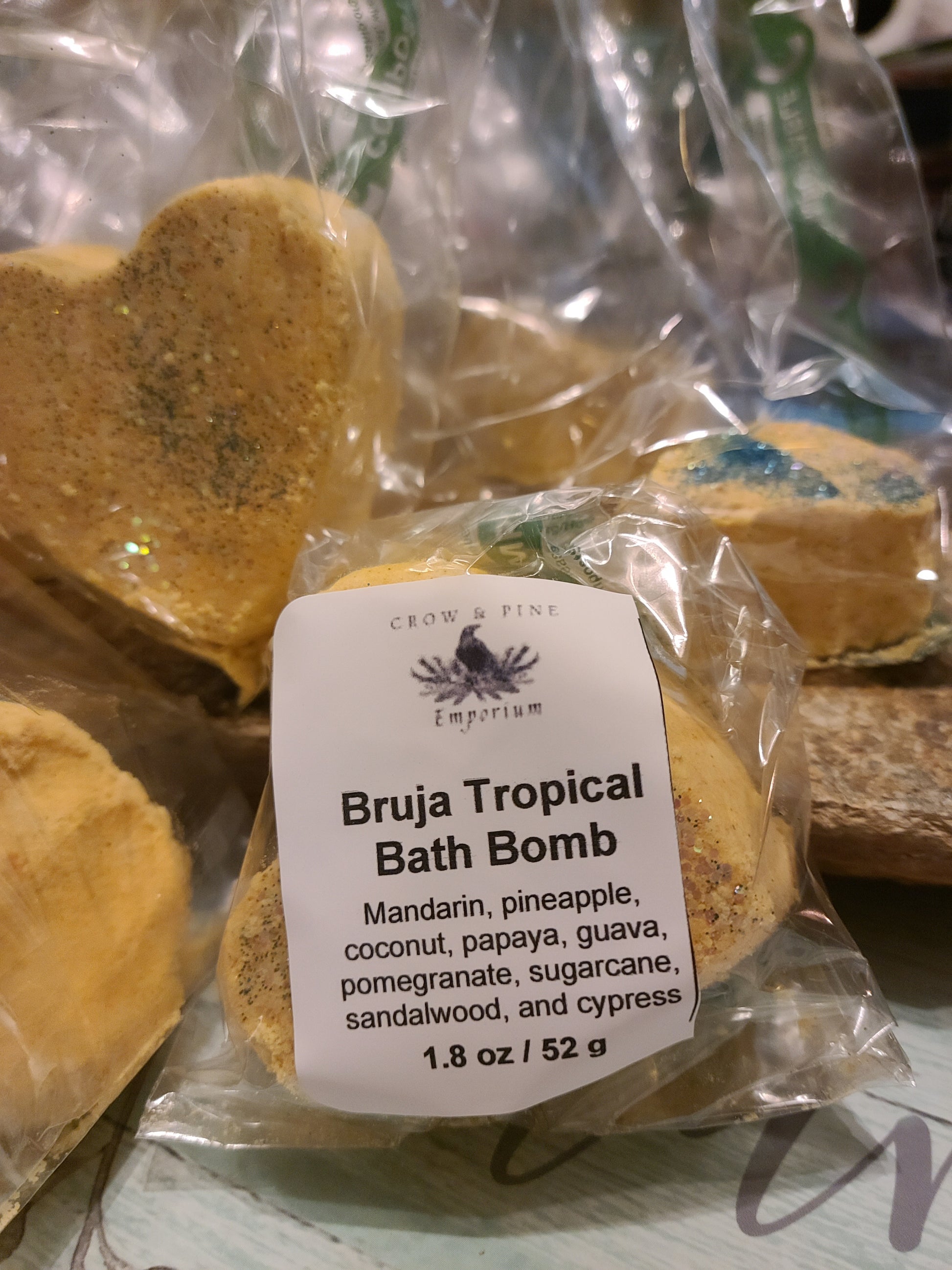 Introduce your senses to a tropical paradise with our Bruja Tropical Vegan Bath Bomb. Featuring a blend of mandarin, pineapple, coconut, papaya, guava, pomegranate, sugarcane, sandalwood, and cypress, this bath bomb will leave your skin feeling refreshed and rejuvenated. Indulge in a vegan, all-natural bathing experience.