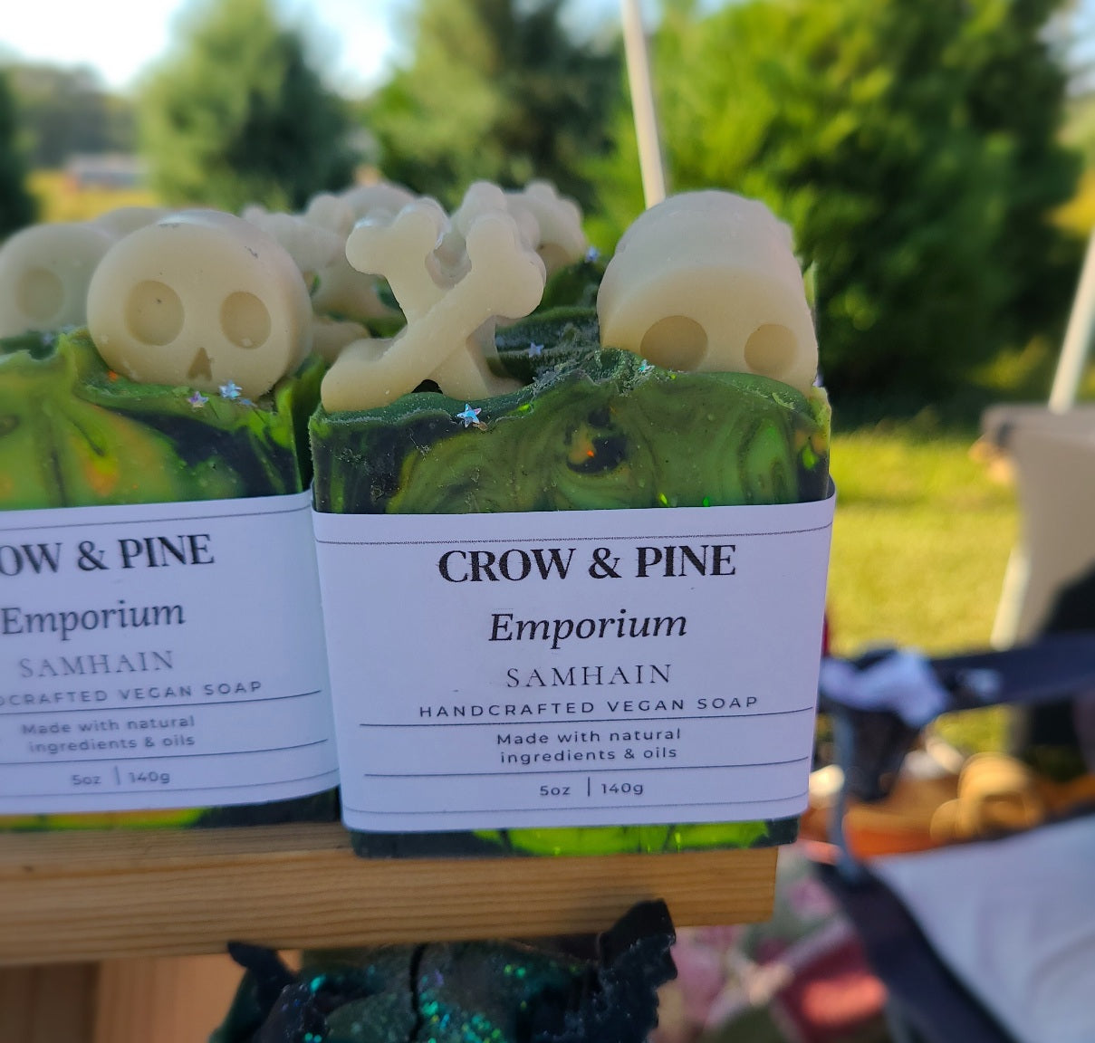 Experience the purest form of cleanliness with our Samhain Handmade Vegan Soap with glow-in-the-dark skull and crossbone imbeds on top!! Made from natural, vegan ingredients like lime, bergamot, frankincense, and laurel, this soap is mild and moisturizing, leaving your skin feeling refreshed and nourished. Eliminate harsh chemicals from your bathing routine and choose Samhain for a gentle yet effective clean.