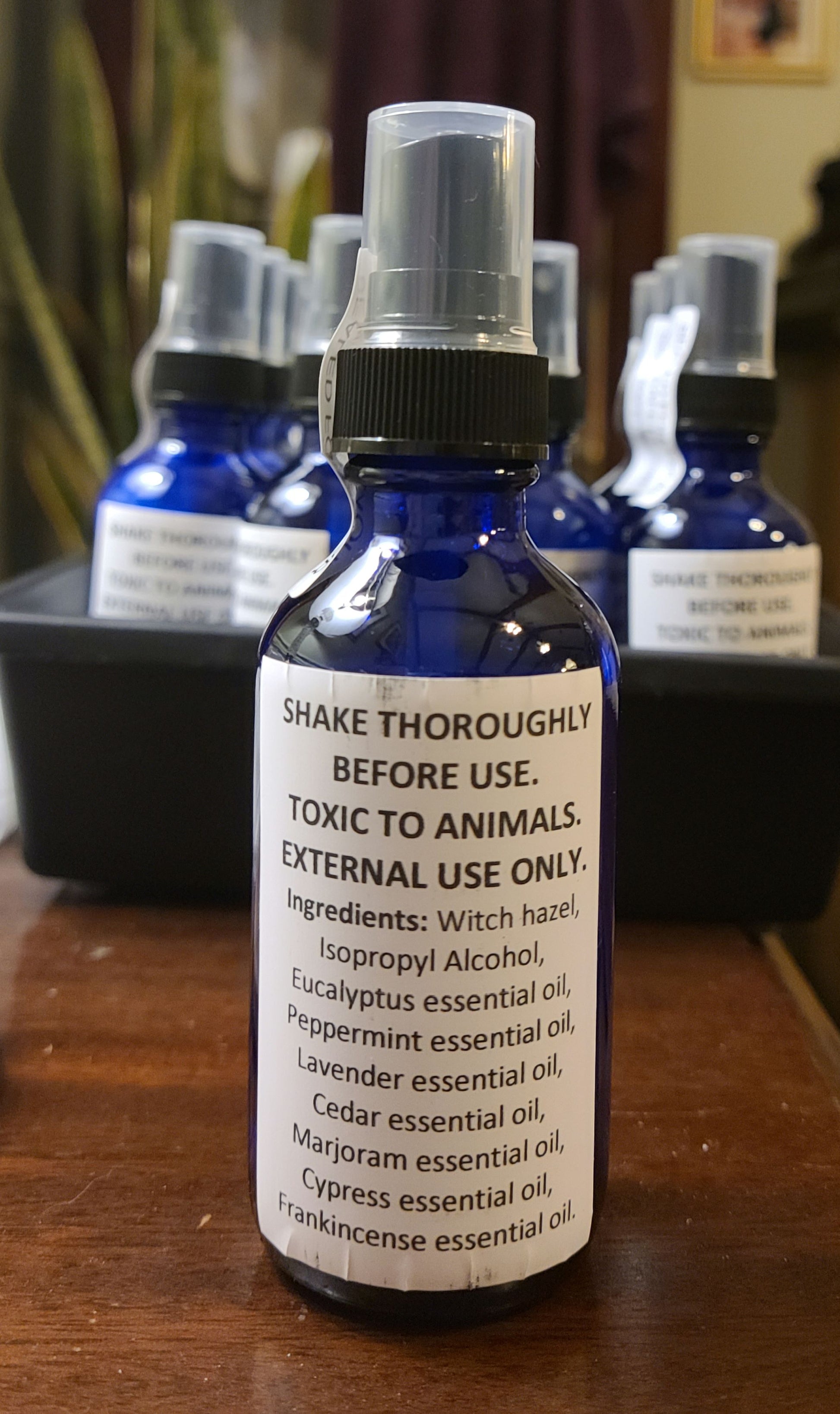 Ingredients: Witch hazel (carrier), Eucalyptus essential oil, Peppermint essential oil, Lavender essential oil, Cedar essential oil, Marjoram essential oil, Cypress essential oil, Frankincense essential oil.