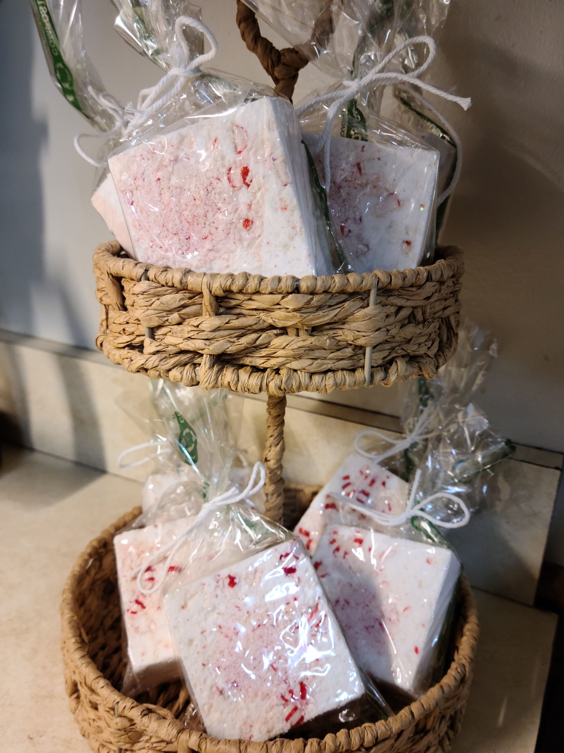 Ingredients: Baking soda, citric acid, corn starch, kaolin clay, coconut oil, mica, peppermint essential oil, rubbing alcohol, peppermint candy.