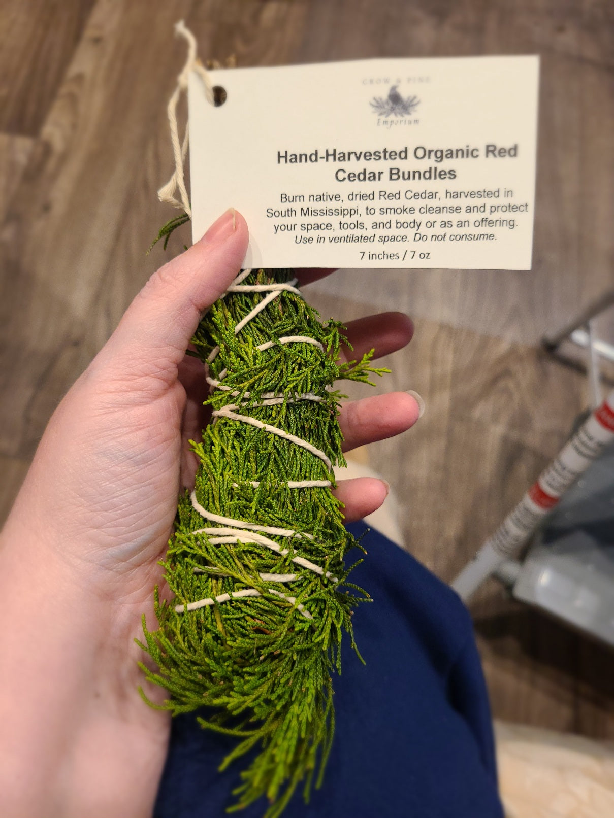 Hand-harvested, organic, native Red Cedar is gathered in South Mississippi, tied and dried for your use in smoke cleaning, blessing, and protecting your home, tools, or body or use as an offering. All bundles are at least 7 ounces in weight. Use in ventilated area. Do not consume. Do not leave unattended.