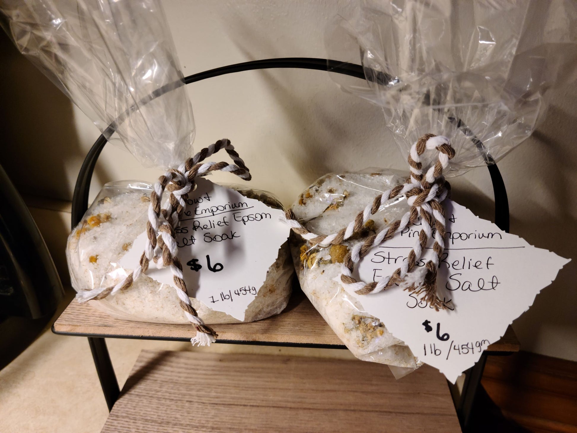 Epsom salt, eucalyptus essential oil, peppermint essential oil, camphor essential oil, and dried chamomile blossoms.